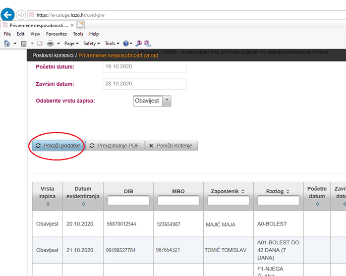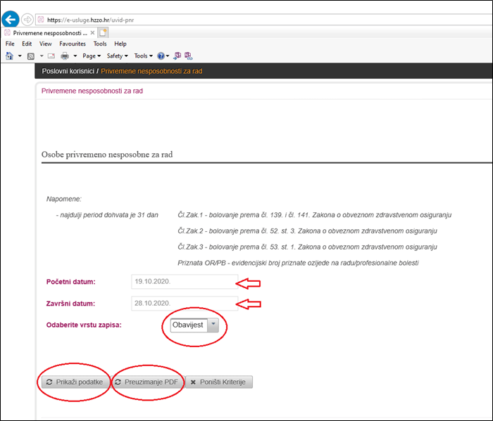 Preuzimanje obavijesti o privremenoj nesposobnosti za rad (e-Zdravstveno)