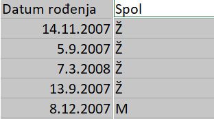 a) Odaberite stupce datum rođenja (stupac E) i spol (stupac F).