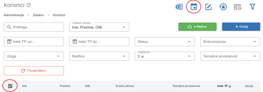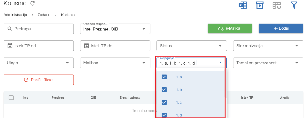 Za odabir grupe željenih razrednih odjeljanja potrebno je odabrati ”korisnike” (prva slika) i kliknuti na prikaži filtere.