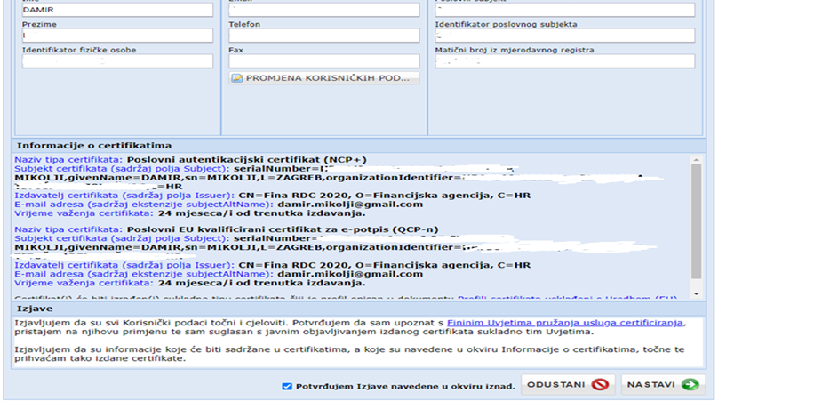 Otvora se prozor sa svim podacima s certifikata, na dnu prozora odaberite kvačicu za ”potvrđujem izjave navedene u okviru iznad” i kliknite ”nastavi”.