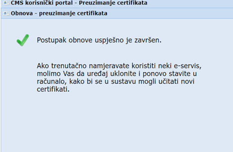 Za kraj slijedi informacija o uspješno završenom postupku obnove certifikata.
