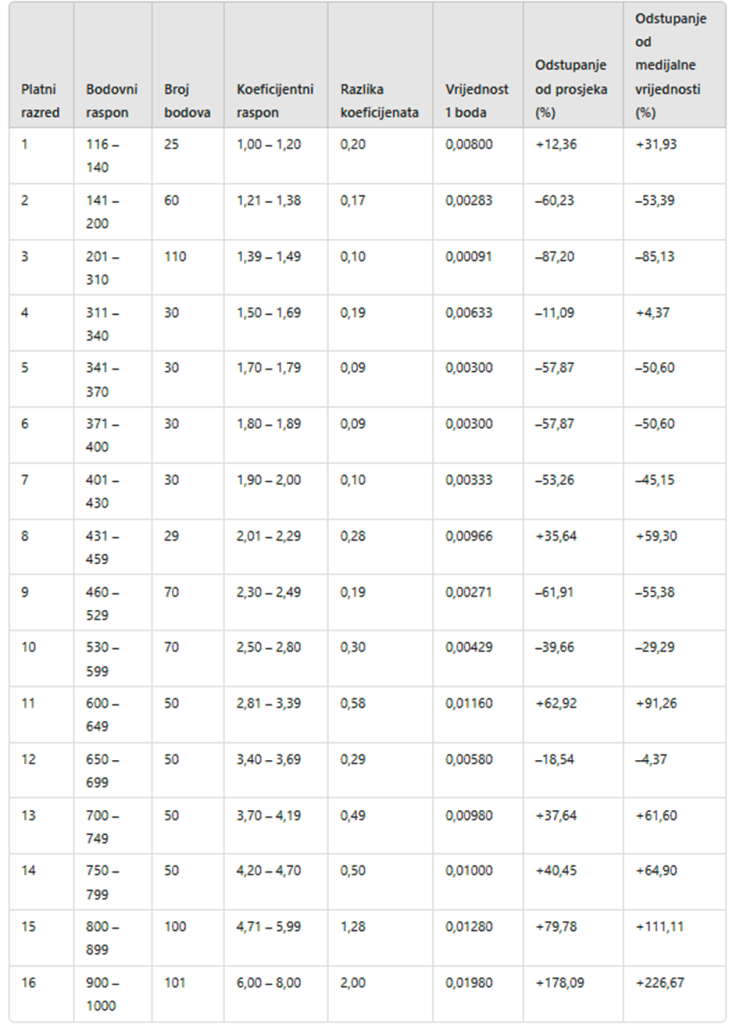 Vrijednost 1 boda je 2076% veća u 16. platnom razredu od 3. platnog razreda.
